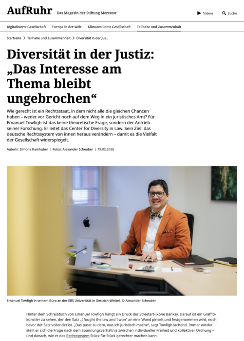Prof. Dr. Emanuel V. Towfigh sprach in einem Interview mit dem Magazin AufRuhr der Stiftung Mercator über Wege zu mehr Diversität im deutschen Rechtssystem und stellte dabei das Center for Diversity in Law vor.